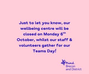 On Monday 6th October, our Wellbeing Centre will be closed as our staff and volunteers come together for our Teams Day. These gatherings are a vital part of how we operate, giving us the space to reflect on our values, strengthen our vision, and explore how we can better support our community.